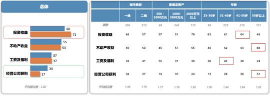 财富净增长家庭中,大部分选择投资收益作为收入变化的原因。41-50岁人群是受惠于投资收益最多的人群;50岁以上人群不动产收益和公司获利的比例最高;31-40岁人群中,依然很大一部分以来工资收入作为财富增长的资金来源。