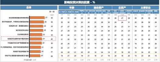 本期调查还显示,富裕家庭对宏观经济及政策环境不确定性的担忧显著降低。“缺乏高质量信息渠道”成为了阻碍投资决策的最重要因素,这在总资产1000-2000万这一最大家庭群体中表现得最为明显。选择“顾问价值低”的比例普遍较低,意味着目前富裕家庭对理财顾问整体的专业程度较为认可。综合两大因素,理财顾问在作为富裕家庭获取信息渠道方面仍非主流,仍有较大的发展空间。