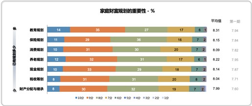 本期“教育规划”在所有财富规划中的重要性评分最高,而上期排名中“养老规划”的评分则为最高。税收规划、财产分配与继承和保险规划重要性提升明显,体现出在国家要求共同富裕的新形势下,受访家庭在新的政策变动预期下已开始积极布局。
