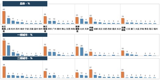 从境内房产分布来看,一线城市的富裕家庭除了自身所在城市,天津、杭州、和珠海是其次要的投资目的地;商品房投资者主要还是集中在一线城市和重点二线城市,并对跨省房产投资兴趣较小。