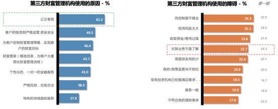 境内投资选择金融机构和平台时,第三方财富机构因为其独立、科学的方式对客户财富进行管理而受到越来越多富裕家庭的青睐;在阻碍富裕家庭选择三方财富机构的因素中,业务的不熟悉有所下降,越来越多的人更注重三方财富本身的经营和风险是否能给他们带来安全感。总体而言,客观公正的定位是优势,风控制度不健全仍是富裕家庭最大担忧。