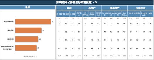 公募基金选择标准同样是以历史业绩和收益为首要条件,但与私募基金不同的是基金规模排名第二。公募基金的规模一定程度上能反映基金经理的认可度。在各类人群中,最看重历史业绩的是流动资产在600万以上的人群,比例达到86%。