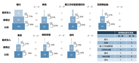 在投资者境内投资平台选择方面,银行在提供境内投资服务方面依然存在较大优势;第三方财富管理机构相比上期进步明显,在“投入最多资金”的机构类型中排名第二,高于券商,仅次于银行。