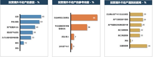 在做出境外不动产投资决策的理由中,投资获取利益是富裕家庭主要的动力和原因,超过半数的人以自己的想法和认知去投资境外不动产,主要是对于房产中介的合法合规性的担忧。境外不动产的投资属性相对更强,养老及资产配置等因素相对次要,且从主观判断角度看,其中隐含了一些风险。