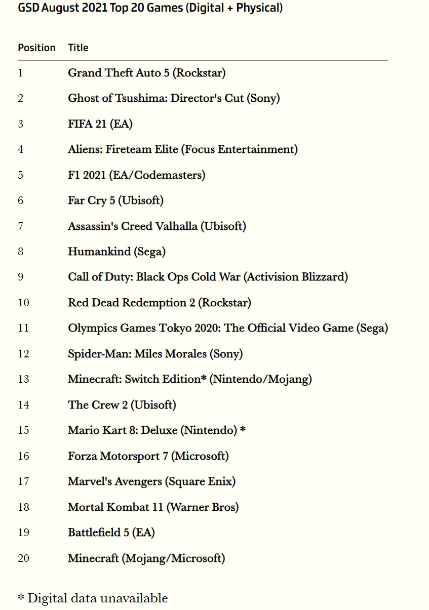游戏软件方面,8月英国最畅销游戏是R星已经发售了8年的老游戏,最畅销的新作是PS5独占《对马岛之鬼:导演剪辑版》,第三名则是EA的《FIFA 21》。