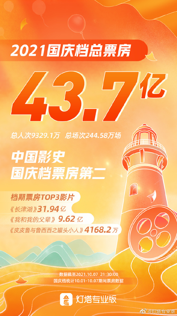 灯塔:2021年10月1-7日我国国庆档总票房达43.7亿 根据灯塔专业版实时数据,截至10月7日21时30分,2021年国庆档(10.1-10.7)总票房达43.7亿超20年同期,位列中国影史国庆档票房第二,总人次9329.1万,总场次244.58万场。 档期票房前三影片分别为: 1.《长津湖》31.94亿(累计33.9亿) 2.《我和我的父辈》9.62亿(累计10.53亿) 3.《皮皮鲁与鲁西西之罐头小人》4168.2万 更多阅读:猫眼研究院:2022国庆档总票房14.9亿灯塔:2021中国电影年度报告 全年票房472.58亿元电资办:2021年3-7日全国电影票房周报电资办:2021年10月25-31日全国电影票房周报电资办:2020年12月28日-2021年1月3日全国电影票房周报电资办:2020年12月全国电影票房月报电资办:2021年7月19-25日全国电影票房周报电资办:2021年7月26日-2021年8月1日全国电影票房周报电资办:2021年7月12-18日全国电影票房周报电资办:2021年7月全国电影票房月报电资办:2021年9月全国电影票房月报电资办:2021年11月22-28日全国电影票房周报电资办:2017年1月1-8日全国电影票房周报电资办:2016年2月全国电影票房月报电资办:2016年3月14-20日本周全国票房8.14亿元 观影人次2512万人