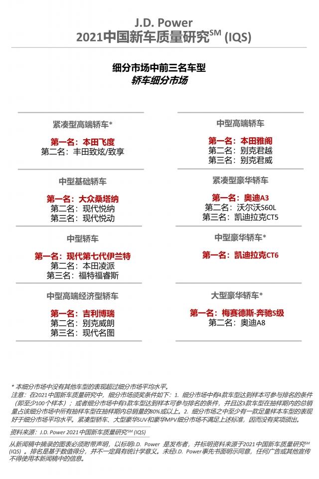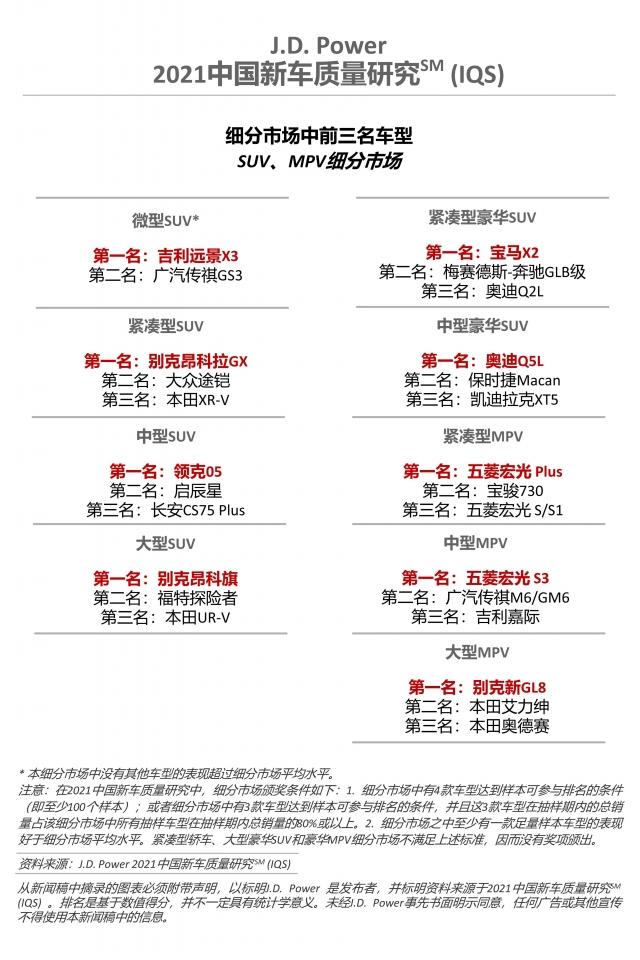车型层面,共有12个品牌的17款车型在2021年中国新车质量研究中摘得17个细分市场奖项。