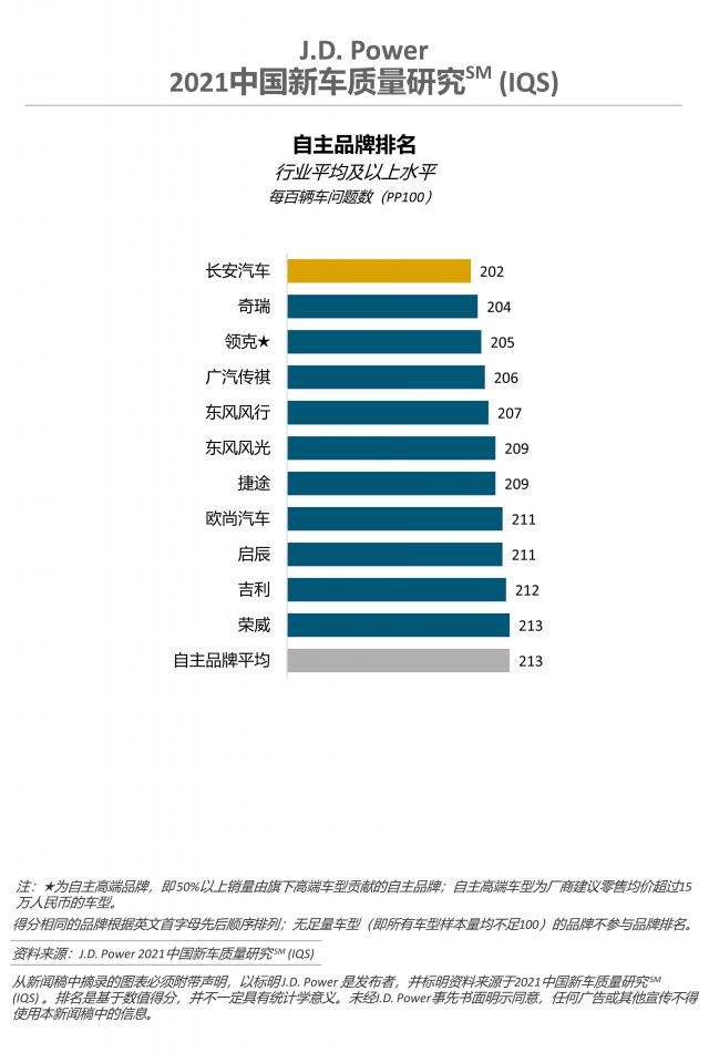 长安汽车(202个PP100)获得中国自主品牌新车质量第一,奇瑞(204个PP100)和领克(205个PP100)分别排名自主品牌第二和第三。