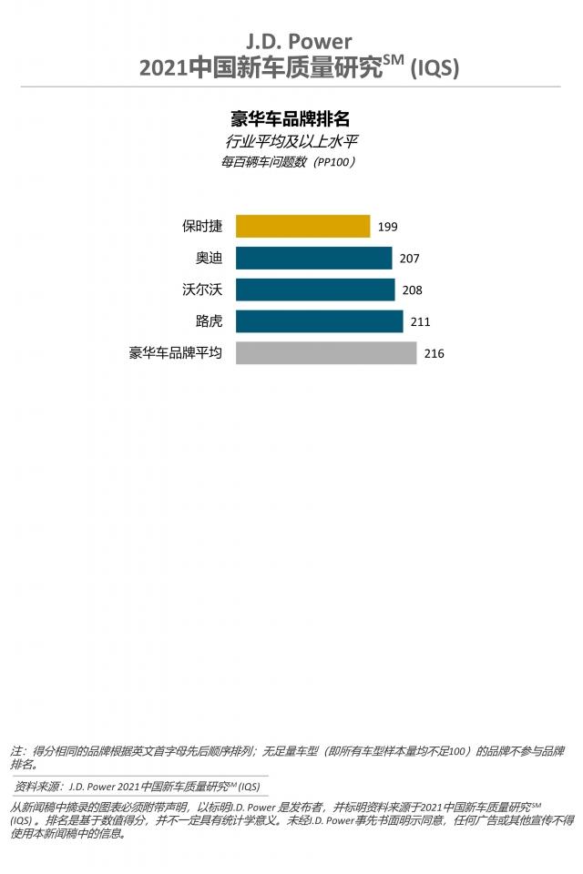 保时捷(199个PP100)荣获豪华车品牌新车质量第一名。奥迪(207个P100)和沃尔沃(208个PP100)分列豪华车品牌第二和第三名。