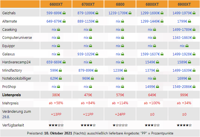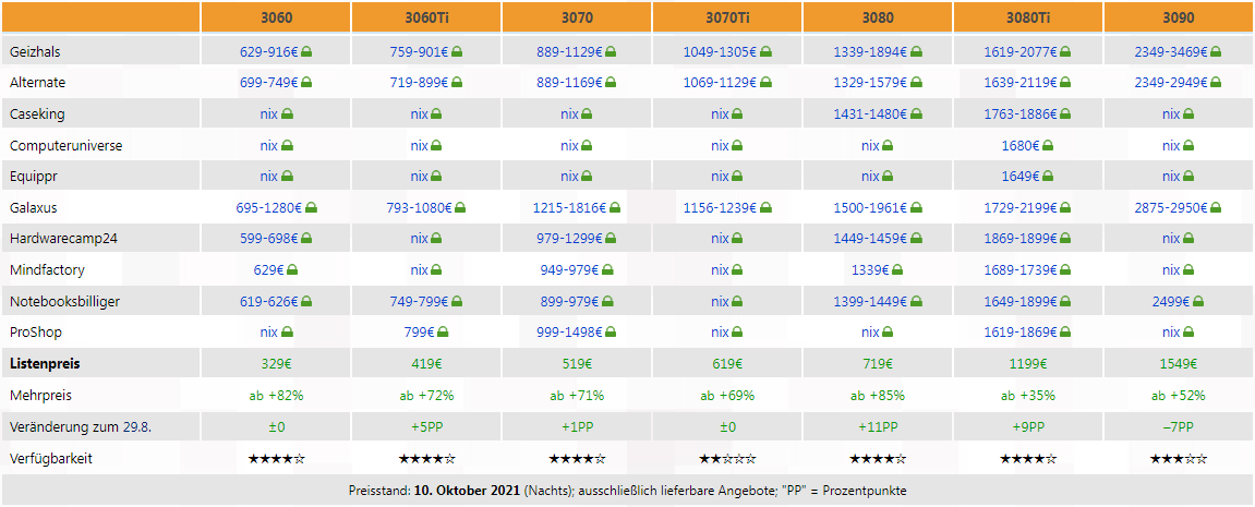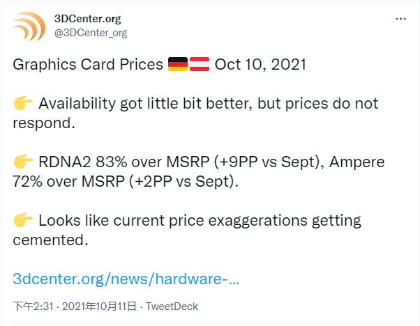 2021 年 10 月显卡价格走势(来自:3DCenter)