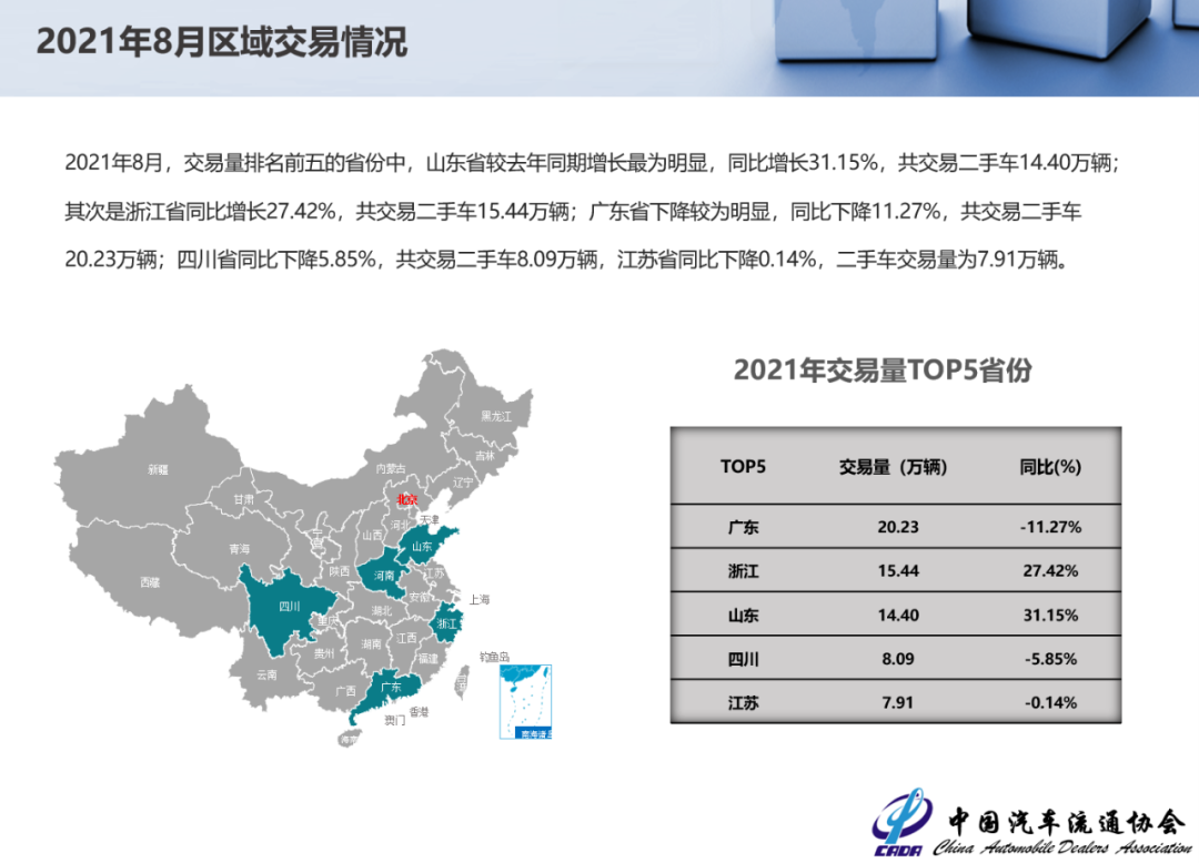 2021年8月,交易量排名前五的省份中,山东省较去年同期增长最为明显,同比增长31.15%,共交易二手车14.40万辆;其次是浙江省同比增长27.42%,共交易二手车15.44万辆;广东省下降较为明显,同比下降11.27%,共交易二手车20.23万辆;四川省同比下降5.85%,共交易二手车8.09万辆,江苏省同比下降0.14%,二手车交易量为7.91万辆。