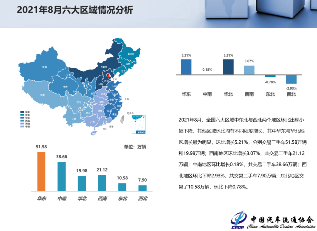 2021年8月,全国二手车交易量为149.82万辆,同比去年同期增长12.08%,增速持续放缓。8月份,本轮疫情得到有效控制,市场客流逐步回升。郑州暴雨灾害造成了大量的机动车受损,带来巨大经济损失的同时也带来了一个巨大的市场缺口。随着受损车辆得到妥善处理,汽车消费需求会逐步释放。