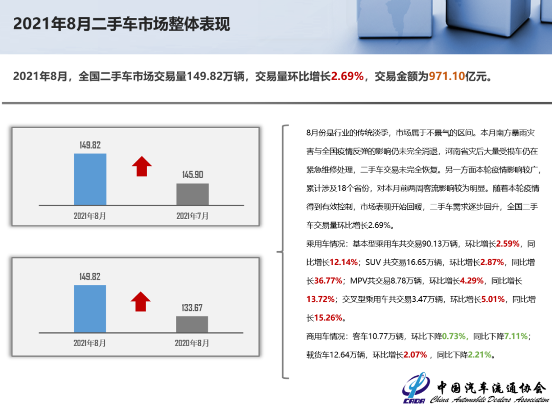 2021年8月,全国二手车市场交易量149.82万辆,交易量环比增长2.69%,交易金额为971.10亿元。