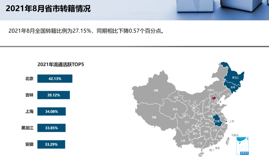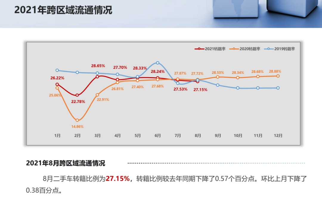 8月二手车转籍比例为27.15%,转籍比例较去年同期下降了0.57个百分点。环比上月下降了0.38百分点。