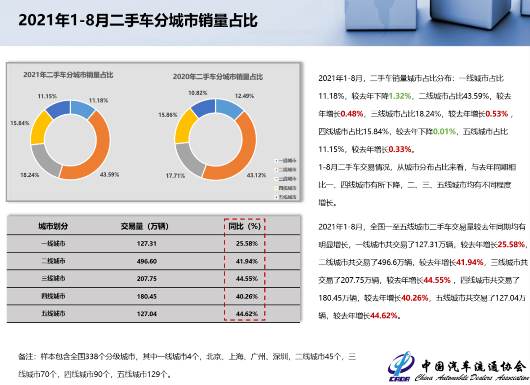 2021年1-8月,二手车销量城市占比分布:一线城市占比11.18%,较去年下降1.32%,二线城市占比43.59%,较去年增长0.48%,三线城市占比18.24%,较去年增长0.53%,四线城市占比15.84%,较去年下降0.01%,五线城市占比11.15%,较去年增长0.33%。