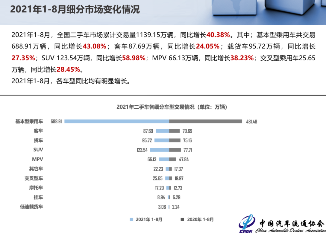 2021年1-8月,全国二手车市场累计交易量1139.15万辆,同比增长40.38%。其中;基本型乘用车共交易688.91万辆,同比增长43.08%;客车87.69万辆,同比增长24.05%;载货车95.72万辆,同比增长27.35%;SUV123.54万辆,同比增长58.98%;MPV66.13万辆,同比增长38.23%;交叉型乘用车25.65万辆,同比增长28.45%。