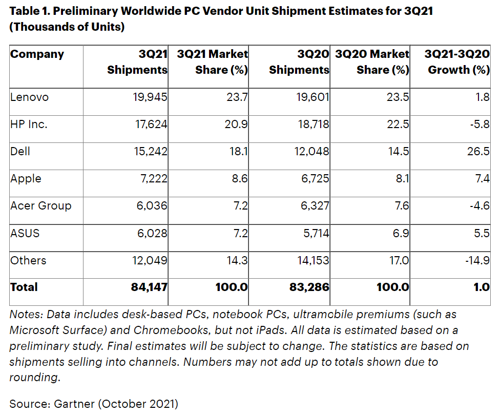 Gartner的最新数据显示,2021 年第三季度全球PC出货量总计8410万台,比 2020 年第三季度增长1%。随着COVID-19疫苗的普及,消费者和教育支出开始增加,从个人电脑转向其他优先事项,这减缓了PC增长势头。