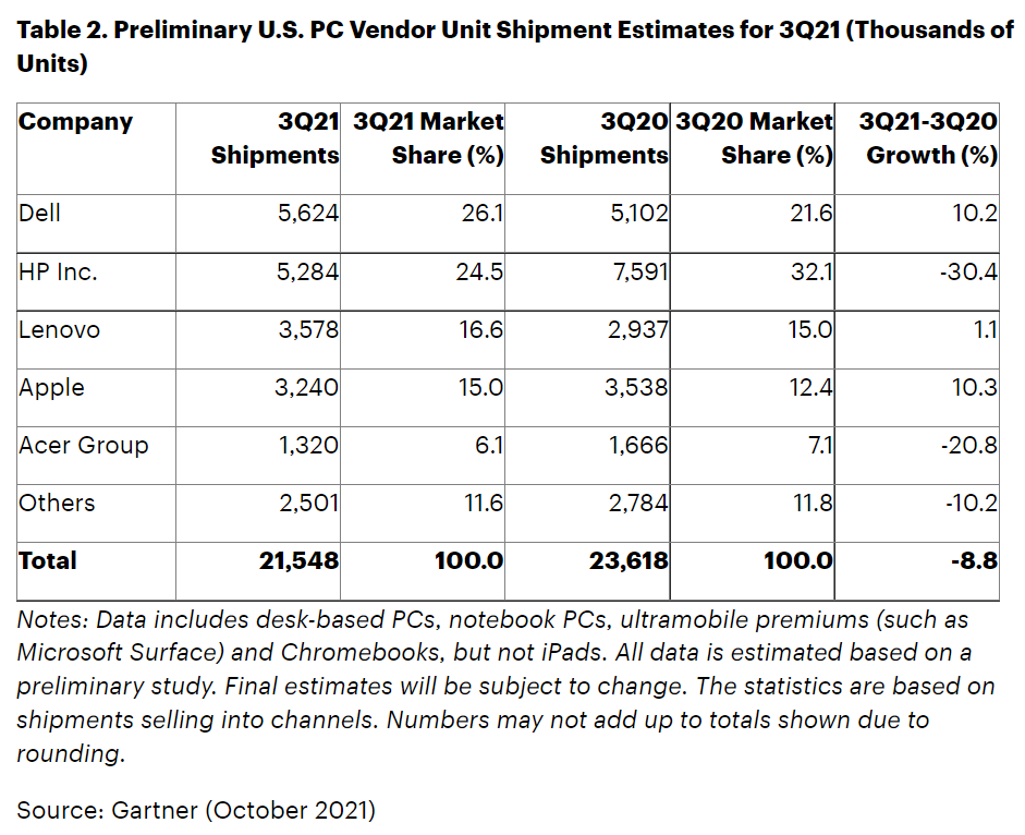 戴尔以26.1%的市场份额稳居美国 PC 市场出货量榜首。惠普紧随其后,占美国 PC 市场的24.5%。