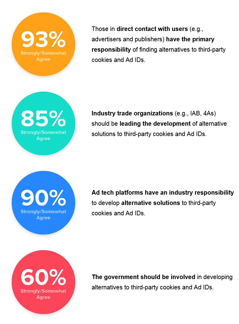 在考虑寻找第三方cookie和移动广告ID(MAIDs)替代品的责任时,大多数广告主同意由两大群体承担: