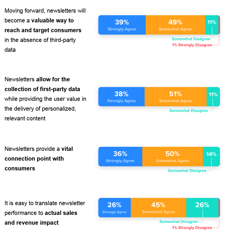 广告主明白,已经严重依赖第一方数据的电子邮件时事通讯将相对不受第三方cookie的影响。因此,9/10的广告主将时事通讯视为在没有第三方数据的情况下接触受众和个性化沟通的一种有价值的方式。