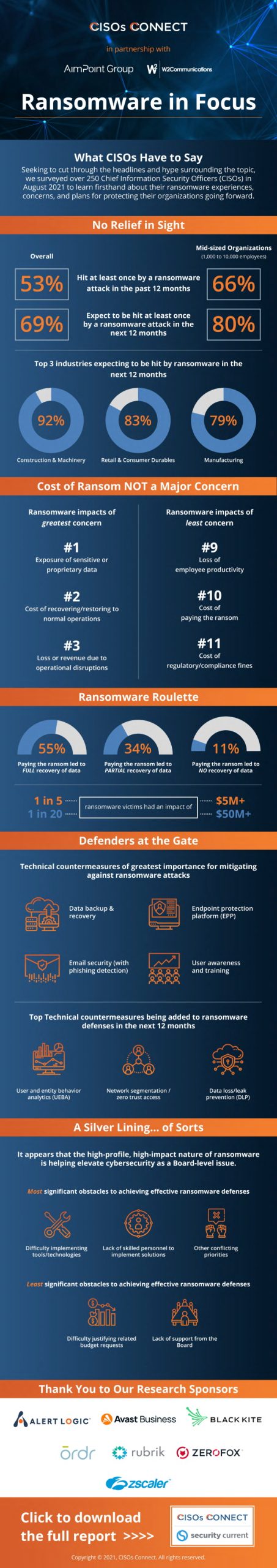 “我们的数据显示,虽然勒索软件的肆虐正在推动一些有关预防与应对的倡议和规划,但许多努力可能仍然是孤立的,”CISOs Connect的首席执行官兼创始人Aimee Rhodes说。”这就造成了某些领域的暴露,随着这些攻击的继续加速,可能会造成问题。根据CISO的反馈,许多人将受益于一种更全面的方法,使他们不仅为预防和检测勒索软件做好准备,而且还为可能的财务影响做好准备。”