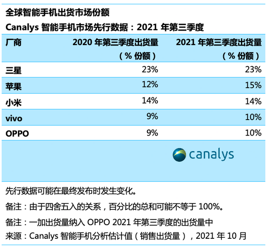2021 年第三季度,由于零部件短缺,厂商难以保证智能手机供应,全球智能手机出货量同比萎缩 6%。 在所有厂商中,三星以 23% 的份额稳居第一。得益于 iPhone 13 的市场早期反响积极,苹果以 15% 的份额重回第二。小米以 14% 的份额位居第三 ,vivo 和 OPPO 紧随其后,均以 10% 的份额并列第五。