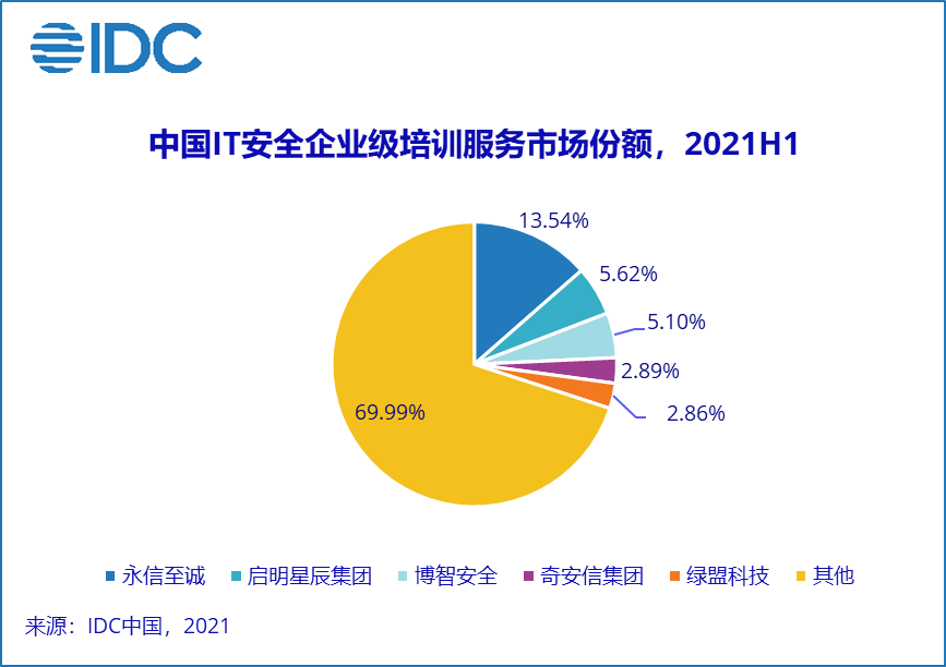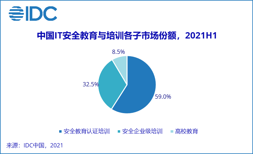 IT安全教育与培训服务:IT安全教育与培训服务是一个教育活动和过程,其中包括企业级培训服务(包括安全意识培训、安全技能培训、大型赛事、安全靶场等服务)、教育认证(包括认证培训、认证考试等)和高校教育三个子市场。2021上半年上述三个子市场份额情况请见下图: