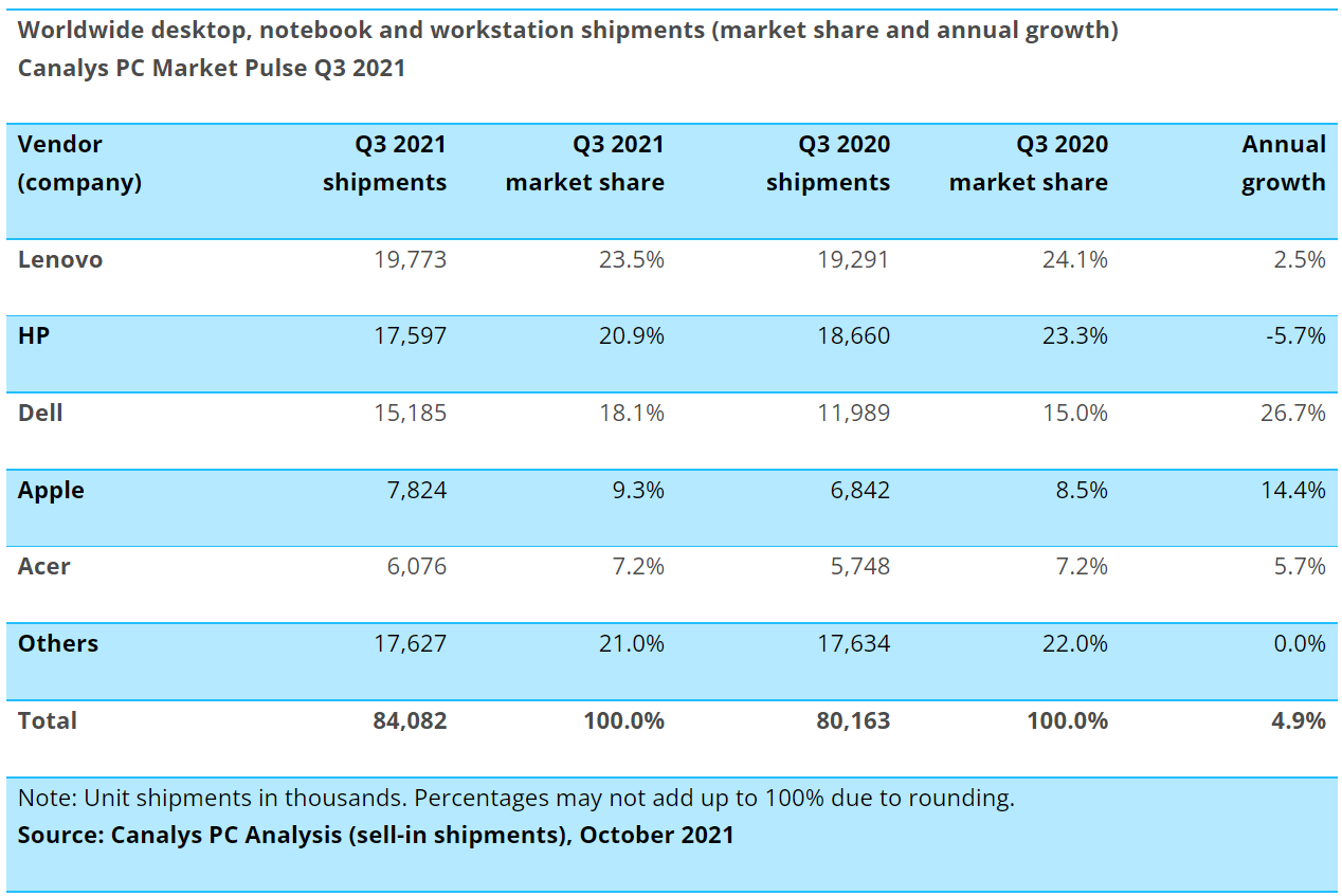 2021年第三季度,在前五大PC供应商中除一家外所有供应商的出货量均继续增长。联想引领市场,出货量为1980万台,同比小幅增长2.5%。惠普保持第二的位置,但出货量下降了5.7%,主要是由于美国Chromebook出货量的下降。排名第三的戴尔是最大的赢家,以26.7%的增幅实现了最高的增长,出货量超过1500万台,市场份额比一年前增长增长了3%。苹果和宏碁分别以14.4%和5.7%的健康增长跻身前五名,前者的市场份额也有所增加。