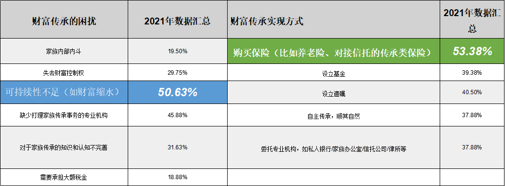 可持续性成为财富传承最大困扰,保险成为首选方式。