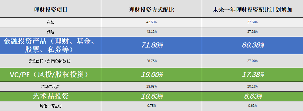金融投资依然是高净值人群财产增值的首选,艺术品和VC/PE投资开始增加,金融投资多元化。