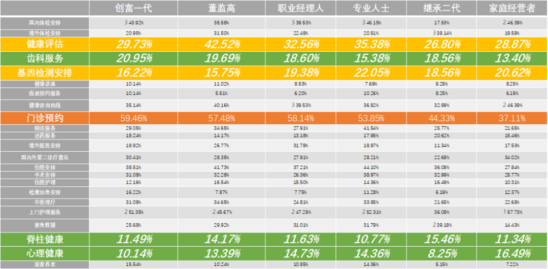 高净值人群需求分化,健康服务专业细化。首先,医疗服务领域费时、费力以及太过专业的“痛点”始终在。其次,随着观念的进步,高净值群体防未病的意识在增加。最后,小众需求显现。