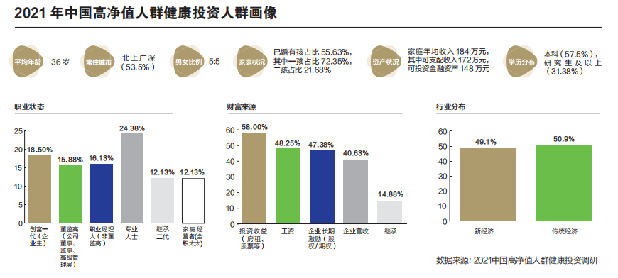 调研人群平均年龄为36岁,男女各半,本科(57.5%),研究生及以上(31.38%)。家庭年均收入184万元,其中可支配收入172万元,可投资金融资产148万元。其中从事新经济的占比49.1%,从事传统经济的是50.9%。年轻化、高学历化以及产业代际升级成为高净值人群的特点。他们具备广阔的视野和丰富人生体验,对于财富的保值增值以及健康管理等第三产业的服务有着更高的需求标准。