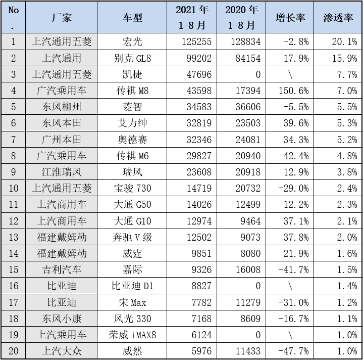 3. TOP20的MPV车型凸显“高大上”