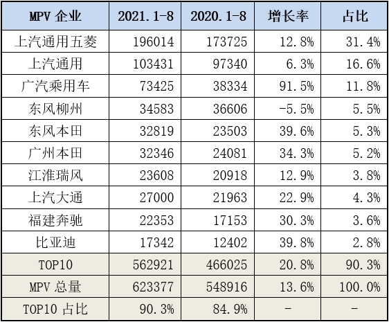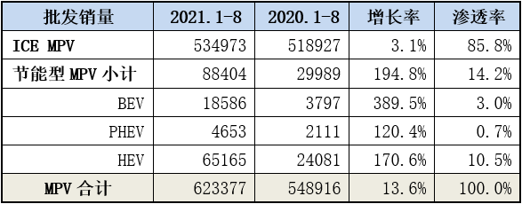 本文将纯电动、插电式混动车和普通混合动力车表述为“节能型MPV”。今年以来MPV市场新能源车(纯电动+插混)和节能车(普通混合动力)的销量表现均超过预期。1-8月纯电动(BEV)车销量达1.9万辆,同比增长389.5%;插混(PHEV)销量4653辆,同比增长120.4%;普混(HEV)销量6.5万辆,增长170.6%;同时期MPV燃油车(ICE)销量53.5万辆,同比增长仅3.1%。由此可见,在MPV市场里的节能车在急起追赶,渗透率已提高到14.2%,其中普混的渗透率超10%,达10.5%,值得要进一步关注。