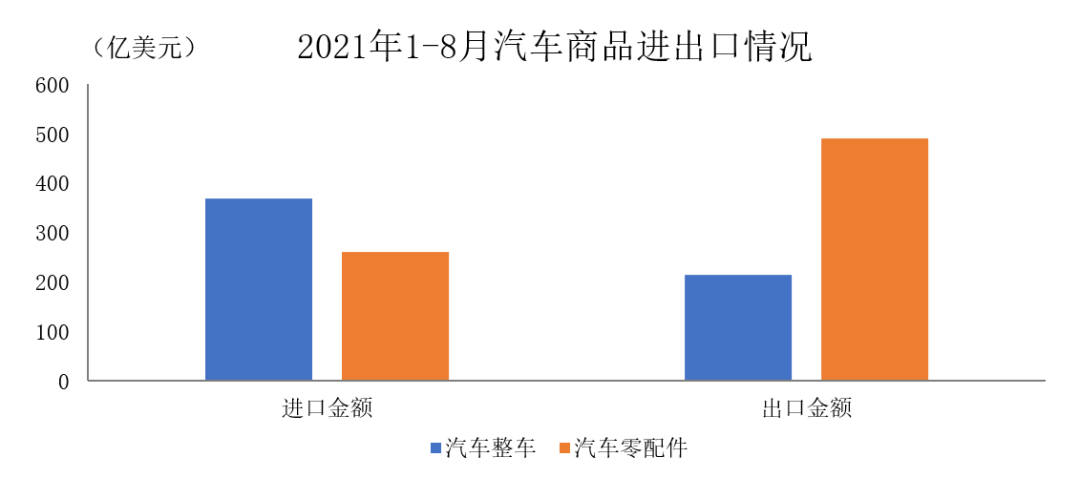 2021 年1-8 月,汽车商品进出口总额 1328.9 亿美元,同比增长 52.4%。其中汽车商品进口金额 627.4 亿美元,同比增长 41.2%;汽车商品出口金额 701.5 亿美元,同比增长 63.9%。