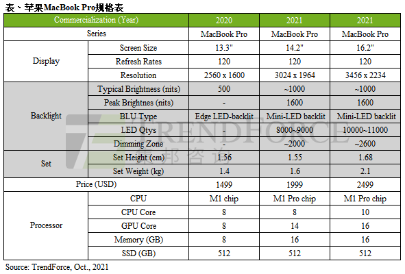 本次新发表的MacBook Pro两种尺寸皆搭载Mini LED背光,预估背光源将采用8000~11000颗Mini LED,搭配背光分区介于2,000~2600区,将显示对比度拉升至1,000,000:1;相比非苹果阵营的Mini LED背光规格,主流规格约在240~512区,相形之下,苹果在显示的规格表现略胜一筹。另外,相较于旧型13.3吋MacBook Pro,14.2吋尽管显示尺寸增加,整机的厚度与重量并未因为升级Mini LED直下式背光,需要增加混光距离与板材用量而更加厚重,反而仍保有与13.3吋背光的轻薄设计。