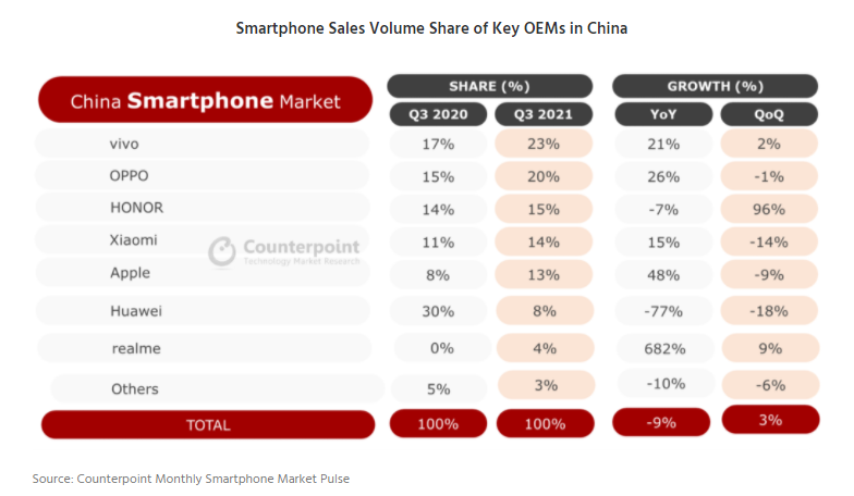 权威调研机构Counterpoint Research发布了Q3季度中国智能手机市场报告,由于需求疲软及供应链缺货,当季总出货量为7650万部,同比下滑9%,不过环比增长了3%。根据他们的报告,Q3季度中国手机市场进一步洗牌,vivo以23%的份额位列第一,出货量同比增长21%,环比增长2%。