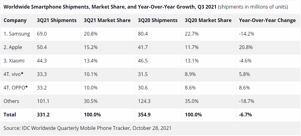 由 IDC 周四发布的最新报告可知:全球智能机市场在 2021 年 3 季度遭受的打击高于预期 —— 于上半年实现了两位数的增长后,3 季度出货量又下滑了 6.7% 。市场研究人员将之归咎于长期困扰诸多设备制造商的供应链中断,在经历了一段相对缓和的时期后,组件短缺问题最终对包括智能机在内的许多相邻行业都产生了不利影响。