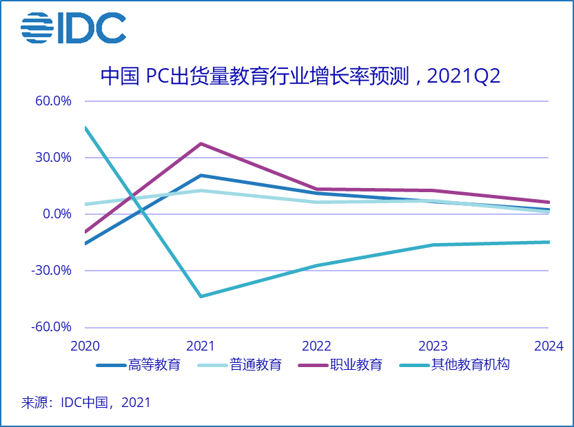 在“构建良好教育生态”的愿景下,“双减”政策在长期会使得学校教育主阵地的位置不断被凸显。IDC预计,未来五年,普通教育、高等教育、职业教育PC采购将保持稳定增长,其中职业教育增速最快,其他教育机构在2021年出现大幅下滑,下半年预计出货6.4万台,同比下滑70.4%。在大力扶持职业教育的政策背景下,职业教育的PC采购量未来五年复合增长率为13.1%,同时,职校内实训教室建设拉动工作站的采购需求。商用显示大屏、电子白板、VR等相关智慧教室系终端产品一定程度上削减了普教的PC采购预算。其他教育机构中的几大线上教育厂商开始探索转型路线,重成人教育、转素质教育,也将战略转向智能教育硬件产品。
