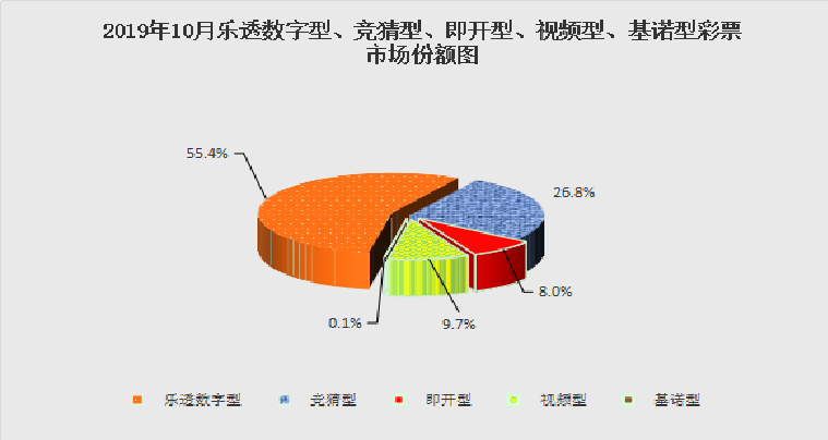 10月份,乐透数字型彩票销售152.89亿元,同比减少76.81亿元,下降33.4%;竞猜型彩票销售73.93亿元,同比减少58.41亿元,下降44.1%;即开型彩票销售21.92亿元,同比增加2.37亿元,增长12.1%;视频型彩票销售26.65亿元,同比减少13.97亿元,下降34.4%;基诺型彩票销售0.12亿元,同比增加0.01亿元,增长12.8%。10月份,乐透数字型、竞猜型、即开型、视频型、基诺型彩票销售量分别占彩票销售总量的55.4%、26.8%、8.0%、9.7%、0.1%。