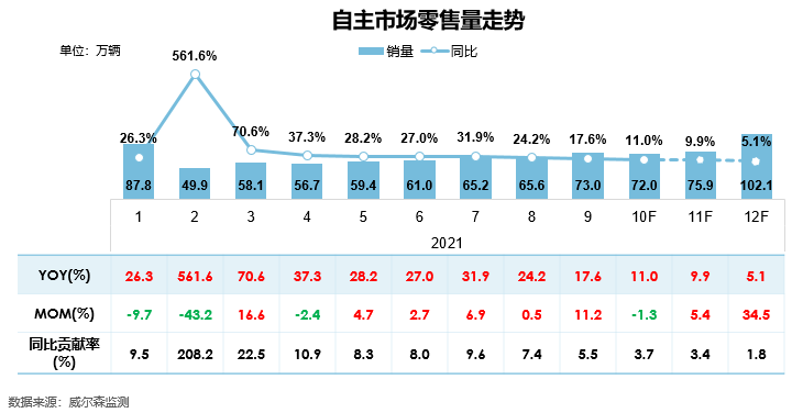 2021年9月自主市场继续保持增长,同比增长17.6%;预测未来短期内将保持向上趋势不变,随着同期销量逐渐上升,增速逐渐放缓。