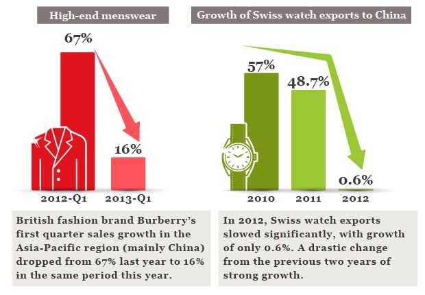 中国新年奢侈品消费从2012年的17亿5000万美元降低到2013年的8亿3000万美元,跌幅达53%。