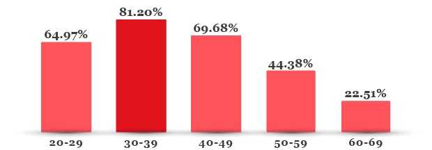 “屌丝”的身份在30—39这个年龄段中最为流行,有超过80%的人自称自己为“屌丝”。
