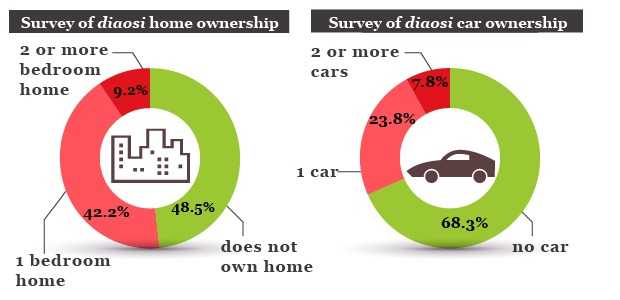 左图(对“屌丝”的房产调查):9.2%的“屌丝”有两套以上的居室,42.2%的“屌丝”有一套居室,48.5%的“屌丝”无房产