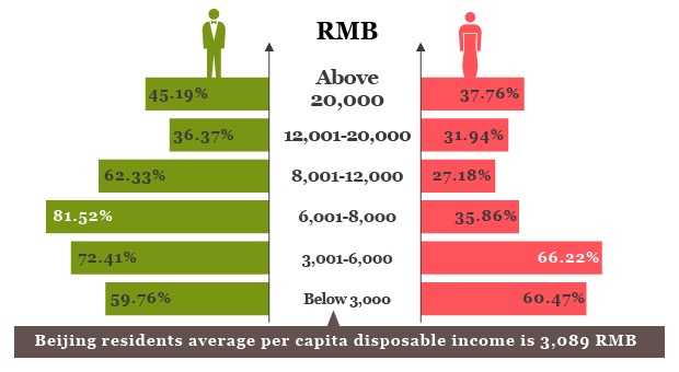 事实上,调查反应每月收入为6001—8000元的男性,以及收入为3001—6000元的女性普遍被认为是“屌丝”。北京居民人均可支配收入为3089元,暗示着大部分自称“屌丝”的人收入其实要比社会平均收入高。另外,他们并不需要关心汽车或房子的问题。