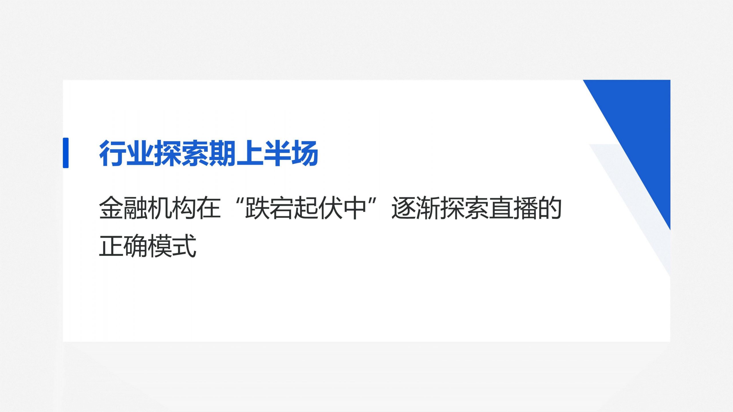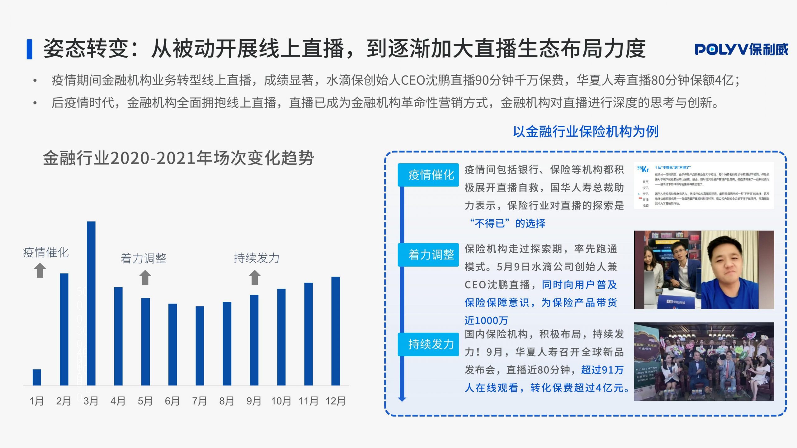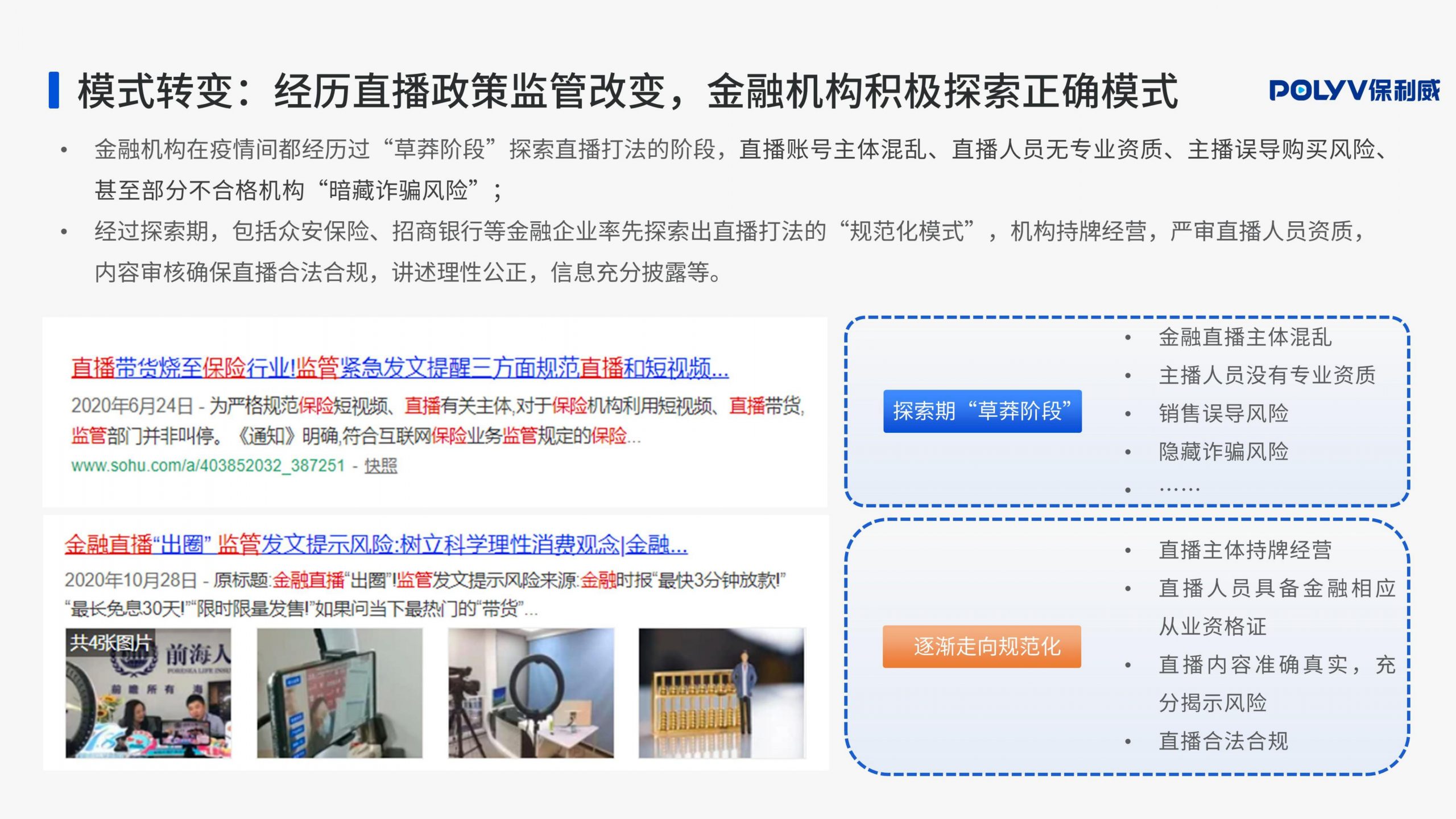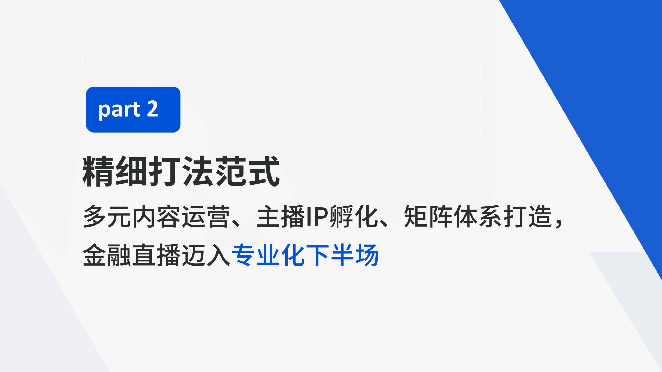 尤其是随着消费者的全面线上化,潜在客户从接触,到感兴趣,再到通过直播咨询一步步成为客户,全链路的金融服务都能在线上完成,直播直接加速了金融服务链路的数字化。在这样的趋势和浪潮之下,粗略式、无体系的直播打法将成为过去式,而精细化的直播内容运营、直播平台升级、营销模式的创新,将开启行业专业化的下半场。