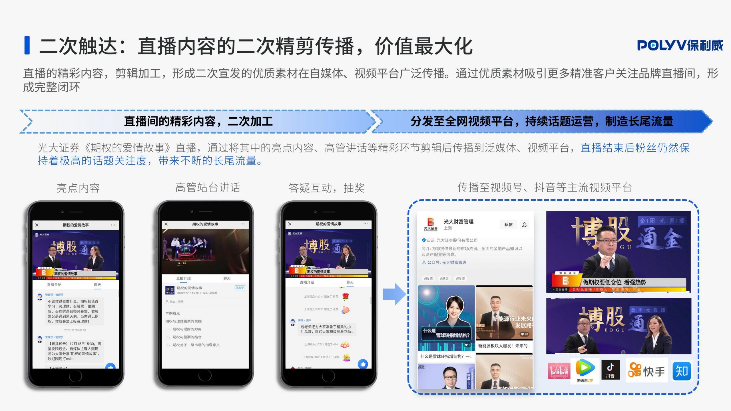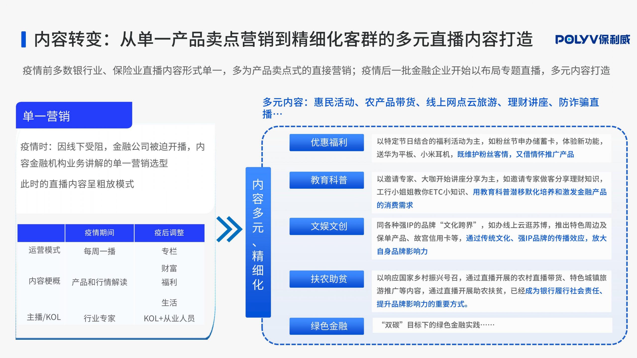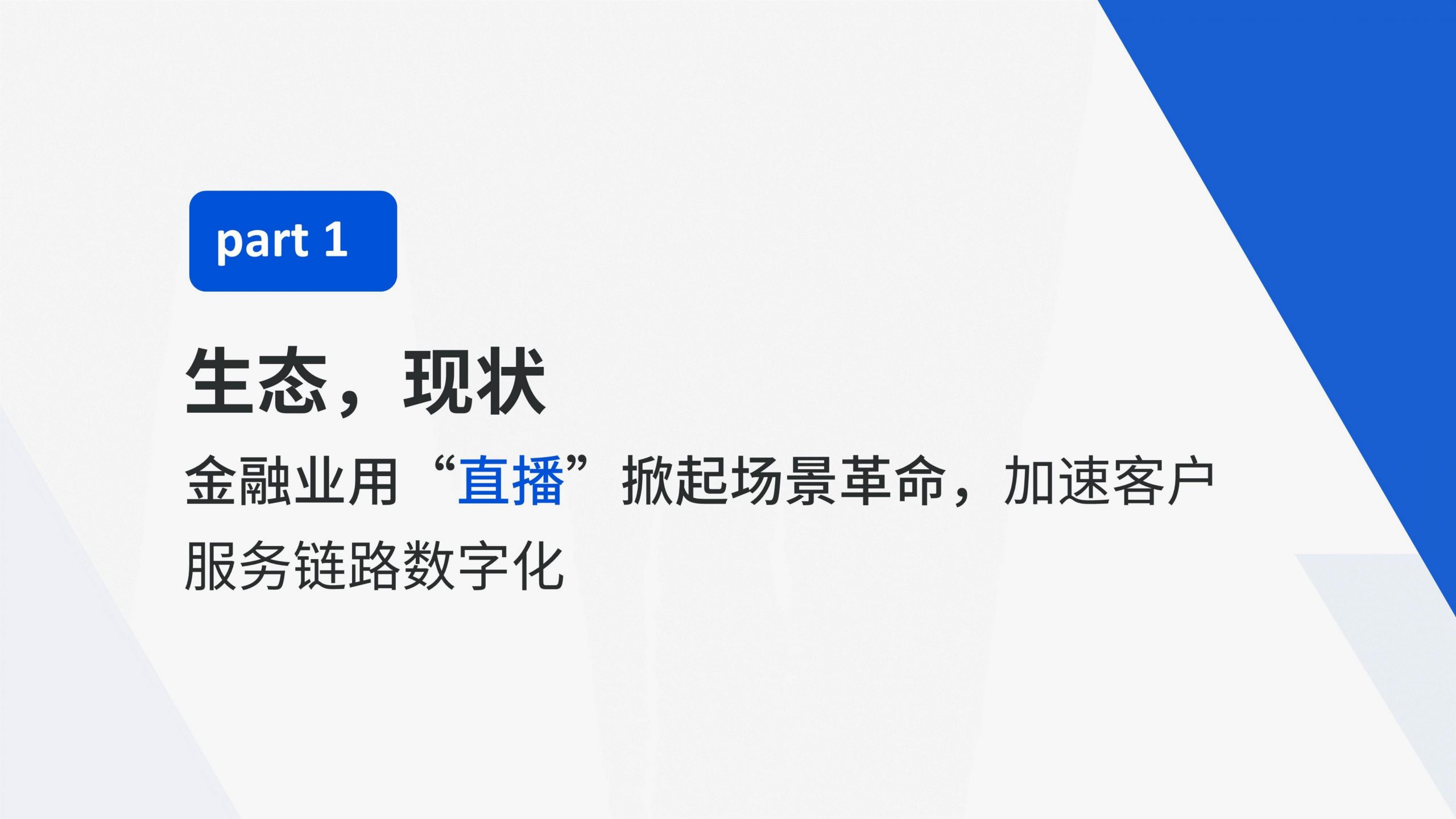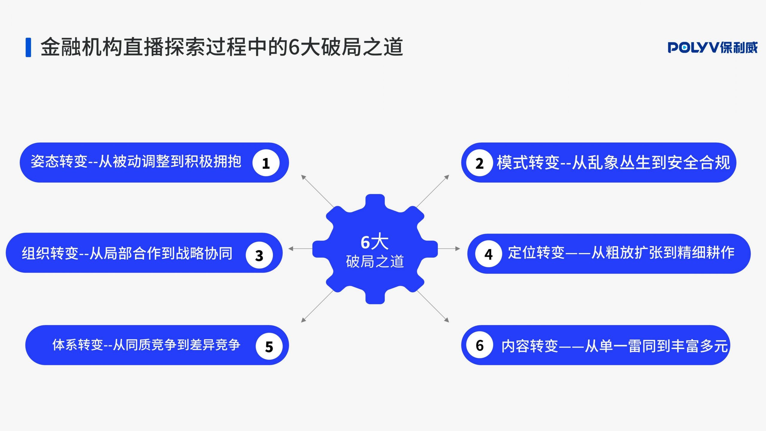 尤其是随着消费者的全面线上化,潜在客户从接触,到感兴趣,再到通过直播咨询一步步成为客户,全链路的金融服务都能在线上完成,直播直接加速了金融服务链路的数字化。在这样的趋势和浪潮之下,粗略式、无体系的直播打法将成为过去式,而精细化的直播内容运营、直播平台升级、营销模式的创新,将开启行业专业化的下半场。