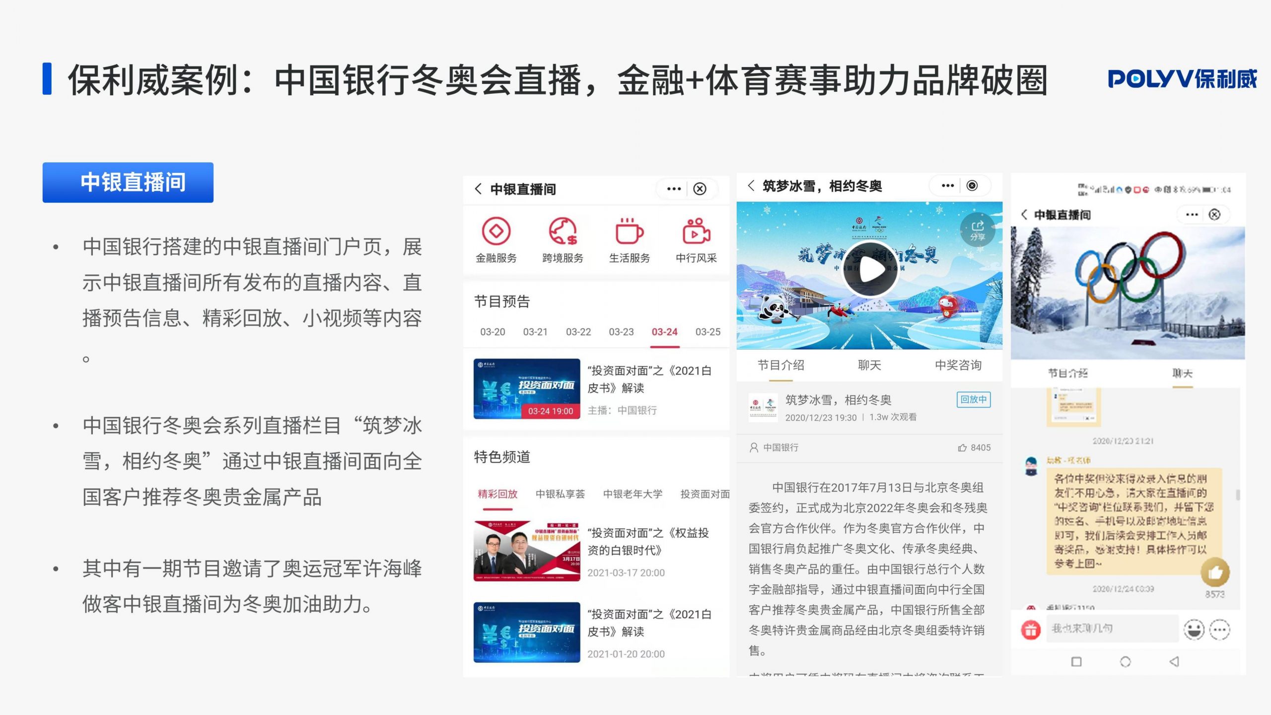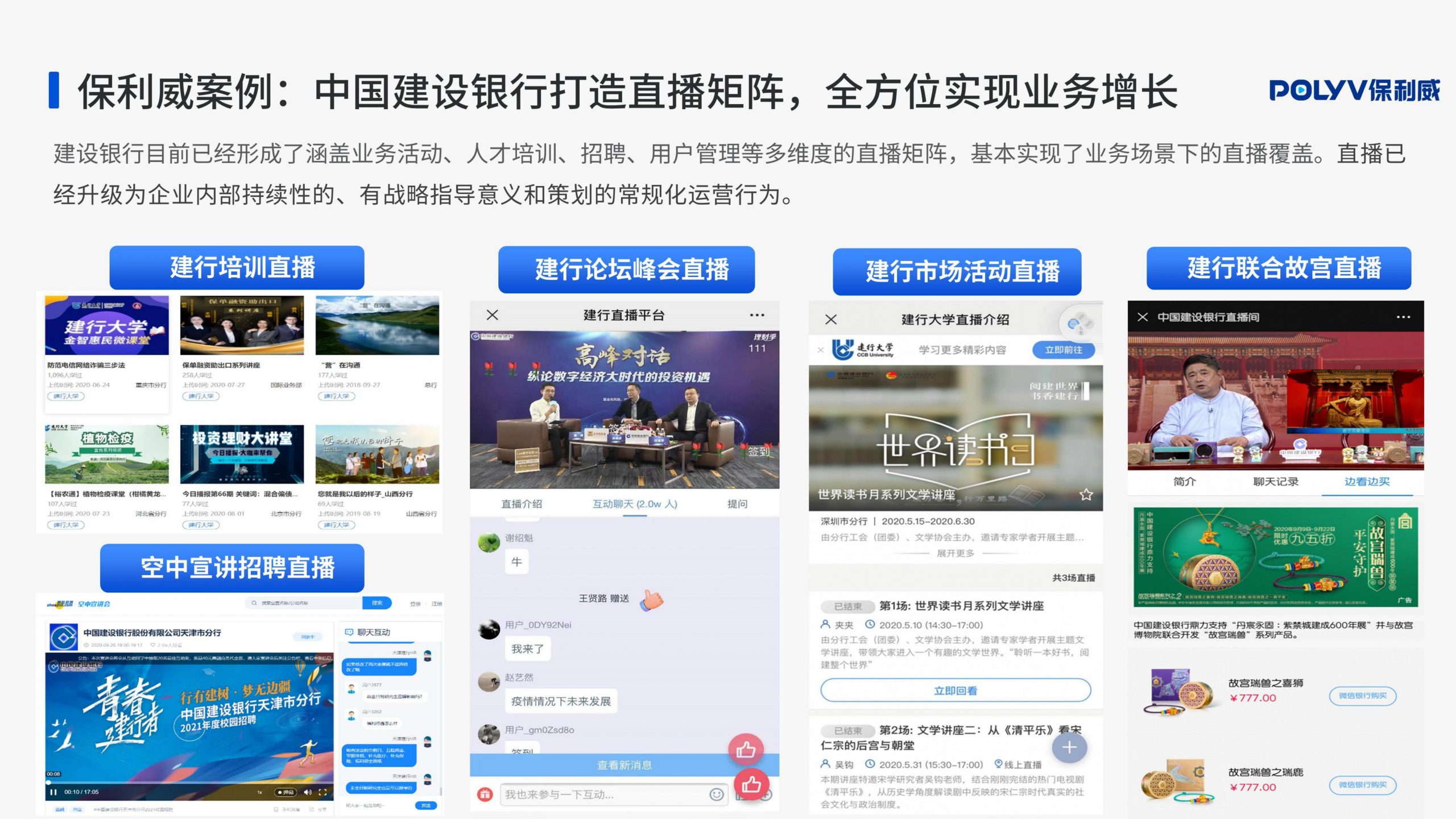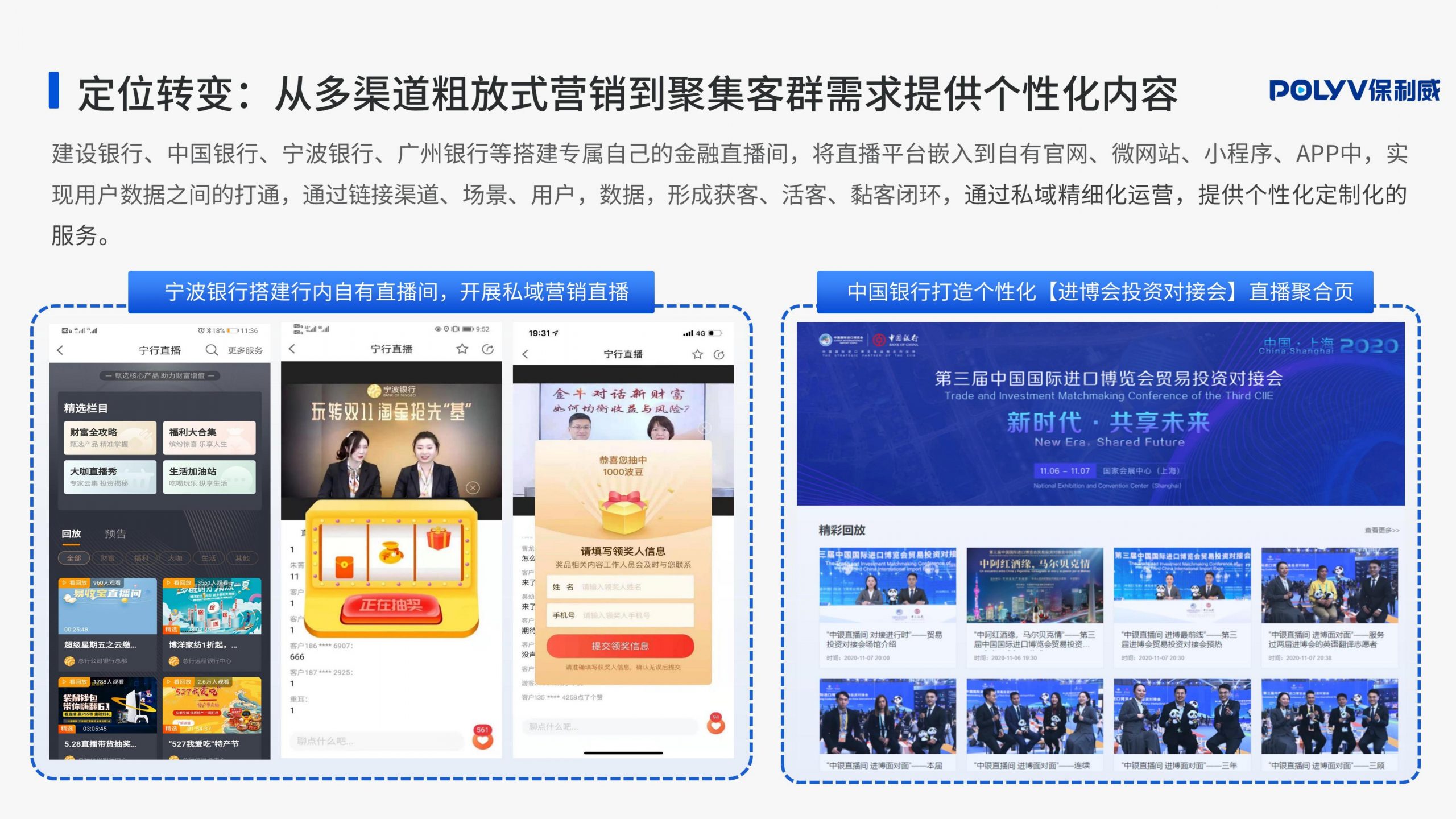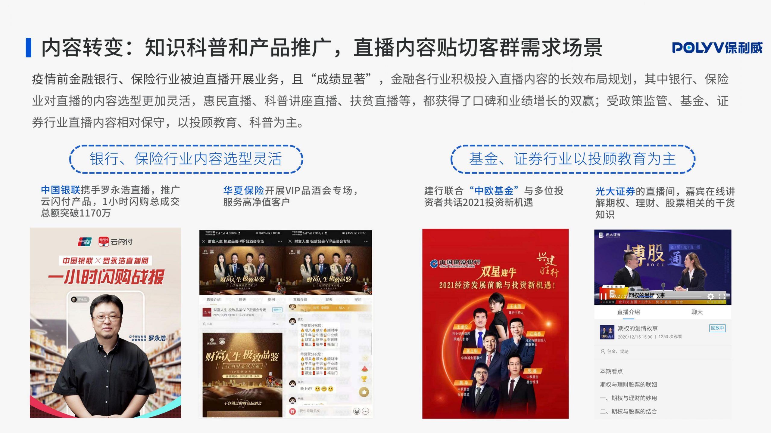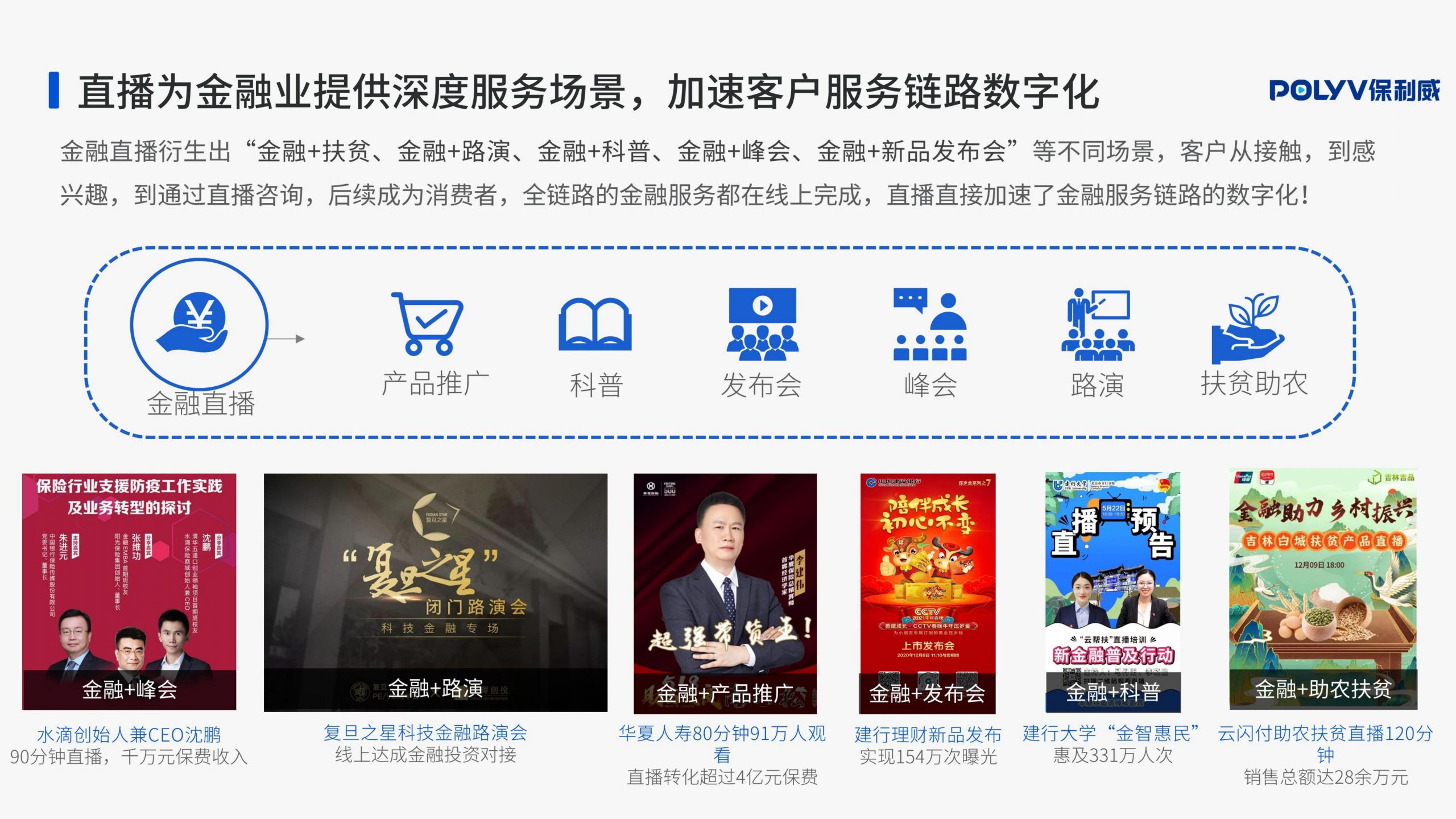 随着业务发展需要,直播正在不断拓展到金融行业各个场景,衍生出“金融+文创、金融+扶贫、投顾服务,除此之外还有路演、科普、峰会、新品发布会”等不同直播场景。