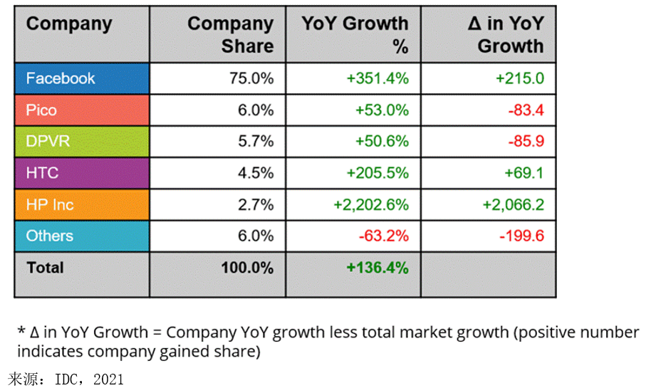 2021年第二季度,VR硬件市场,Facebook 保持了领先地位,出货量约为 160 万台(同比增长 351%)。主要由 Oculus 推动,其Quest 2产品实现了巨大增长,部分原因是由于去年同季度供应链受限。与此同时,Pico 位居第二,该公司继续巩固其作为 Oculus 在消费和商业领域替代品的地位。