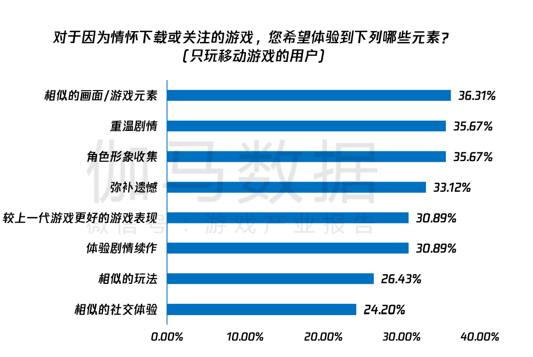 据伽马数据调查,87.2%的用户明确表示会受到情怀游戏的吸引,也从侧面证明情怀打法的可行。关注情怀的移动游戏用户更加注重情怀在游戏中的复现,体验相似的元素是当前用户的主要诉求。